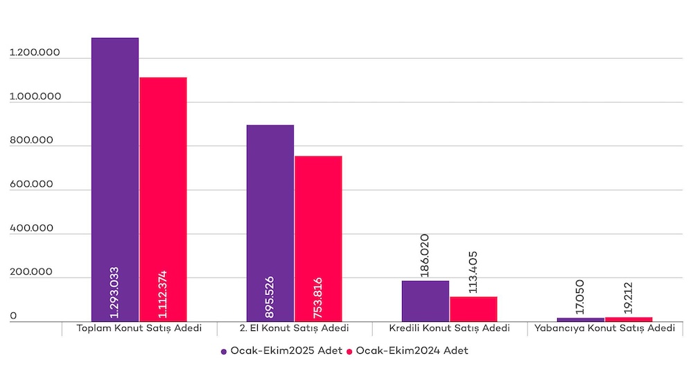 Konut satış adetlerine baktığımızda Ekim ayında 164 bin 306 konut satıldığı görülüyor. Bu rakam ile konut satış adedi geçen senenin Ekim ayına göre %0,5 oranında düşüş göstermiş oldu. 2025 yılının Ocak-Ekim döneminde ise konut satışları geçen senenin aynı dönemine göre %16,2 artarak 1 milyon 293 bin 33 olarak gerçekleşti. Geçen senenin Ocak-Ekim dönemi ile karşılaştırıldığında, en dikkat çekici artışın %64,0 ile ipotekli (kredili) konut satışlarında olduğu görülüyor.
