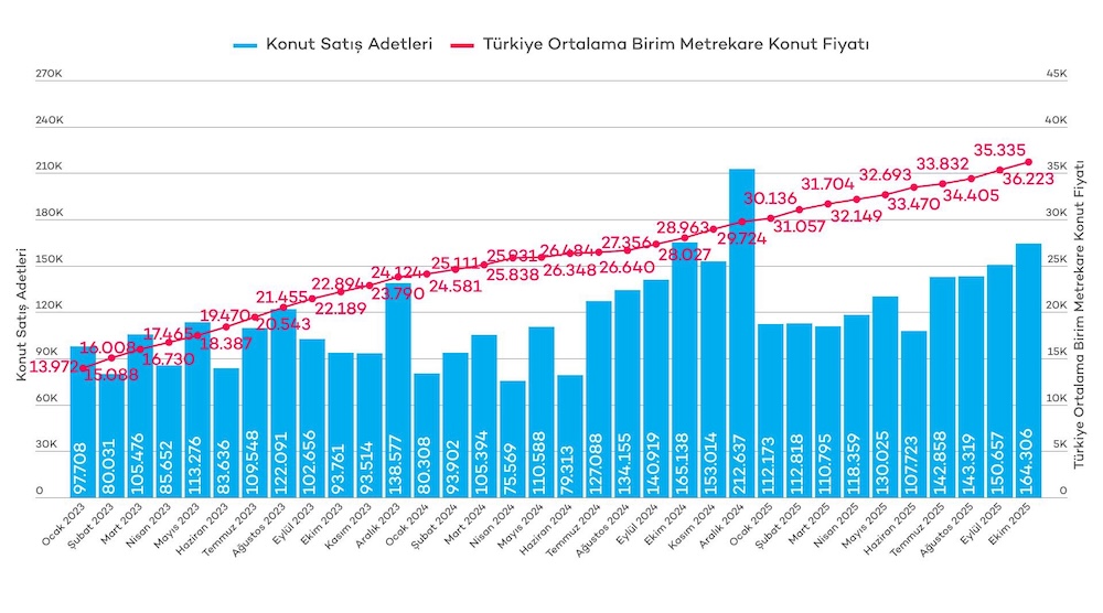 Verilere göre, ekim ayında Türkiye genelinde satılık konut fiyatları yıllık bazda %29,2 aylık bazda ise %2,5 artış gösterdi. Enflasyon etkisi göz önüne alındığında fiyatlar bir yılda reel olarak %2,9 aylık bazda ise %0,4 düştü. Ortalama konut metrekare satış fiyatı 36 bin 223 TL iken, ortalama konut fiyatı ise 4,5 milyon TL oldu. Konut yatırımının geri dönüş süresi 13 yıl olarak hesaplandı.