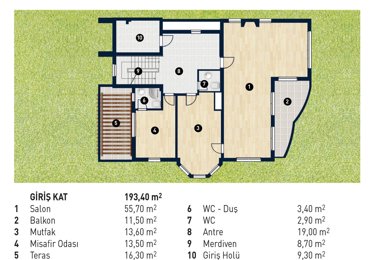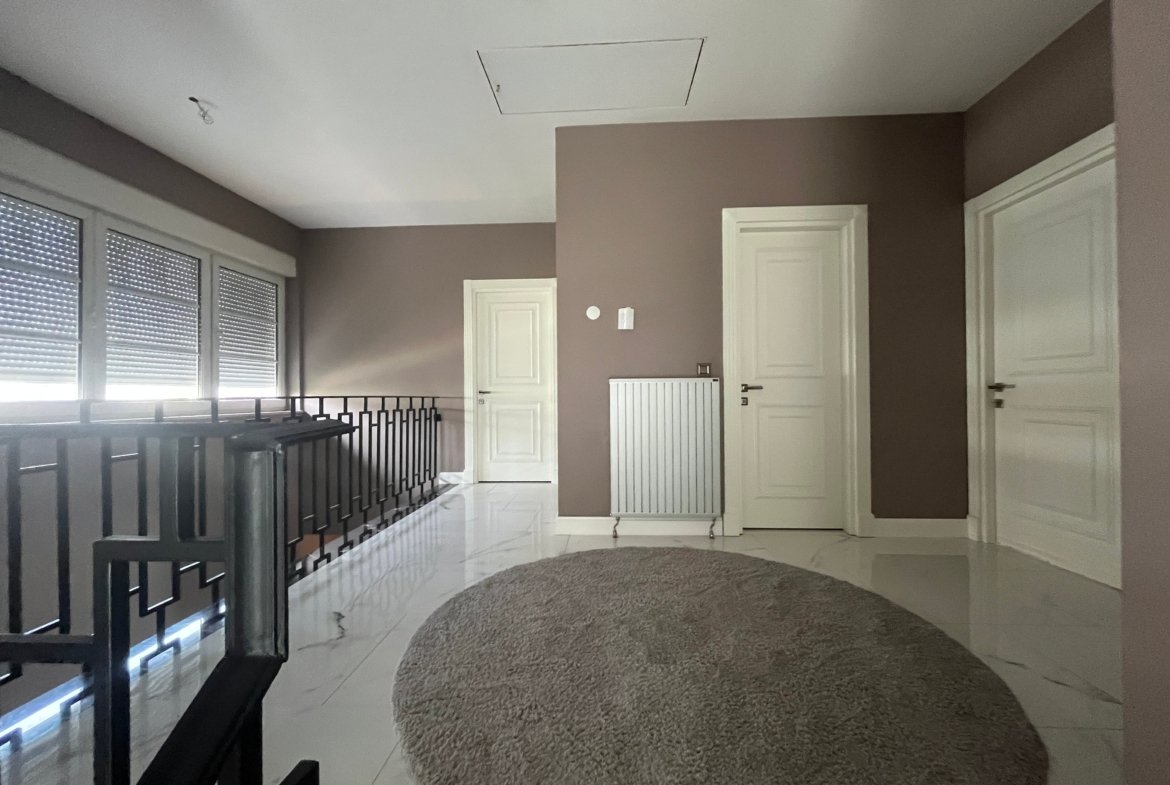 Giriş katında ferah antre, yüksek tavanlı, teraslı salon, salonda ve bahçe salonunda şömine montaj imkânı, geniş ve fonksiyonel mutfak, içinde banyo olan çalışma/misafir odası, bahçe katında hobby odası, home theatre veya bahçe salonu olarak kullanılabilen geniş mekânlar, iki araçlık otomatik kapalı garaj, çamaşır odası, hizmetli odası, sauna yeri, birinci katta teraslı geniş ebeveyn süite, iki geniş çocuk yatak odası, kulede manzaralı hobby odası ve teras, geniş depolar ve saklama yerleri mevcuttur.